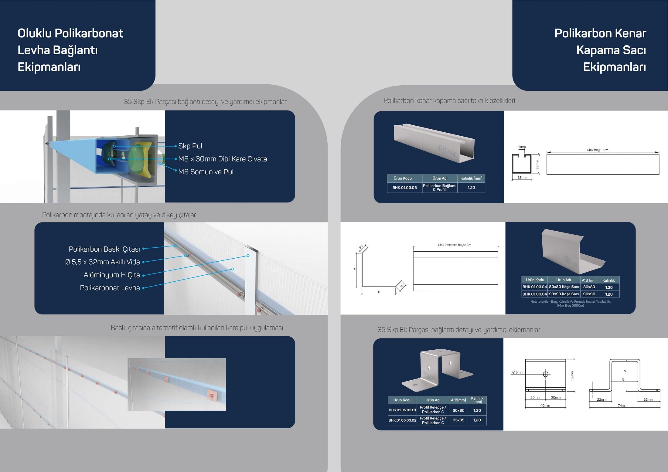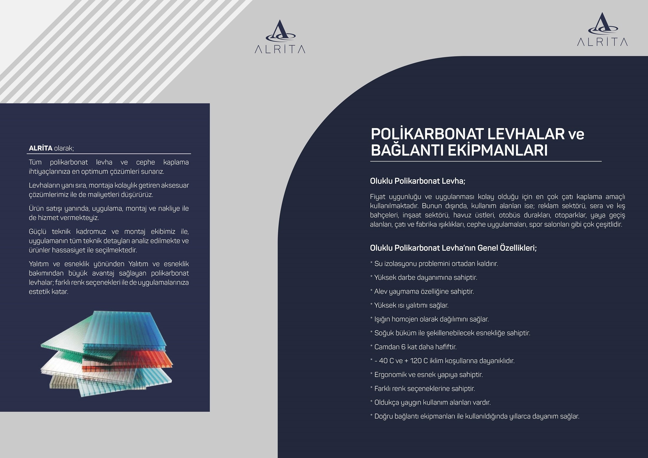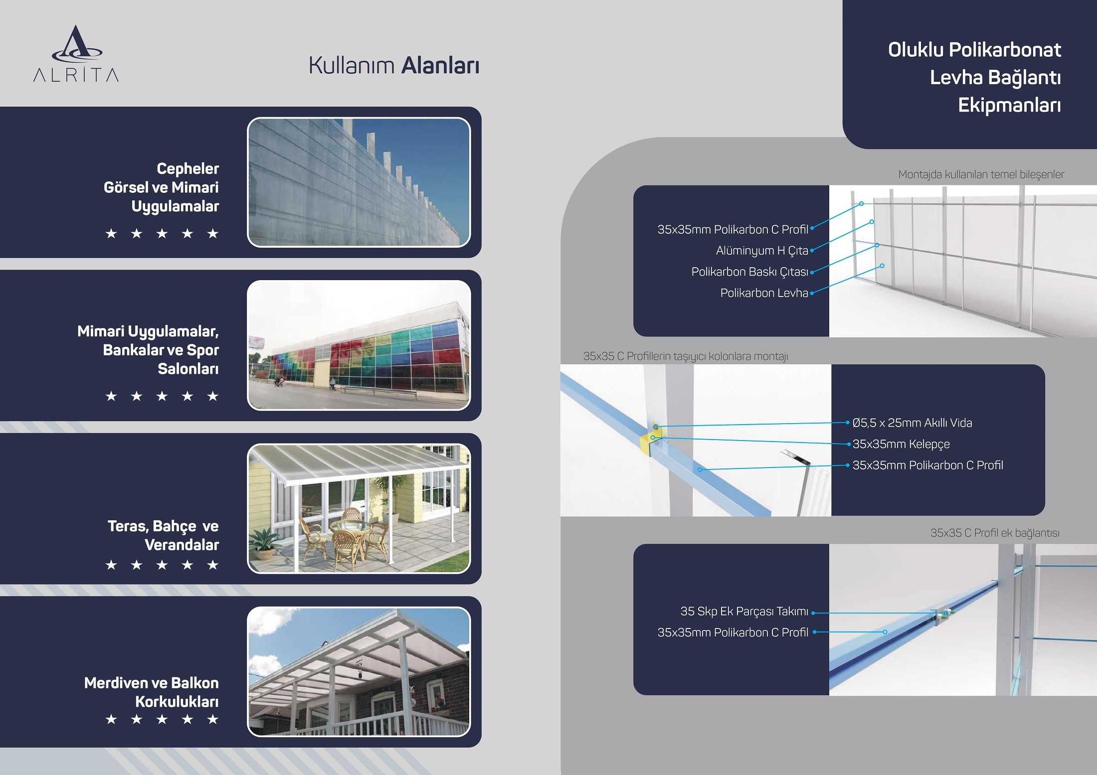 Profesyonel montaj uzmanlar tarafından yapılması gereken profesyonel bir iştir. Küçük hatalar dönülmez sonuçlara yol açıp ekonomik kayıplara neden olabilir. Bağlantı ekipmanlarının yerli ve ithal modelleri bulunmakla birlikte yerli modellerin ithal olanlara göre daha fazla dayanım gösterdiği bilinmektedir. Bu ekipmanları dünyanın her bir köşesine temin ediyoruz. Alrita A.Ş. kendi imal ettiği bağlantı ekipmanları malzemelerine kolaylıkla temin edebilirsiniz. Polikarbon bağlantı ekipmanları kargo ile ülkemizin her yerine ulaştırılabilmektedir.
